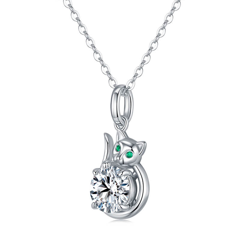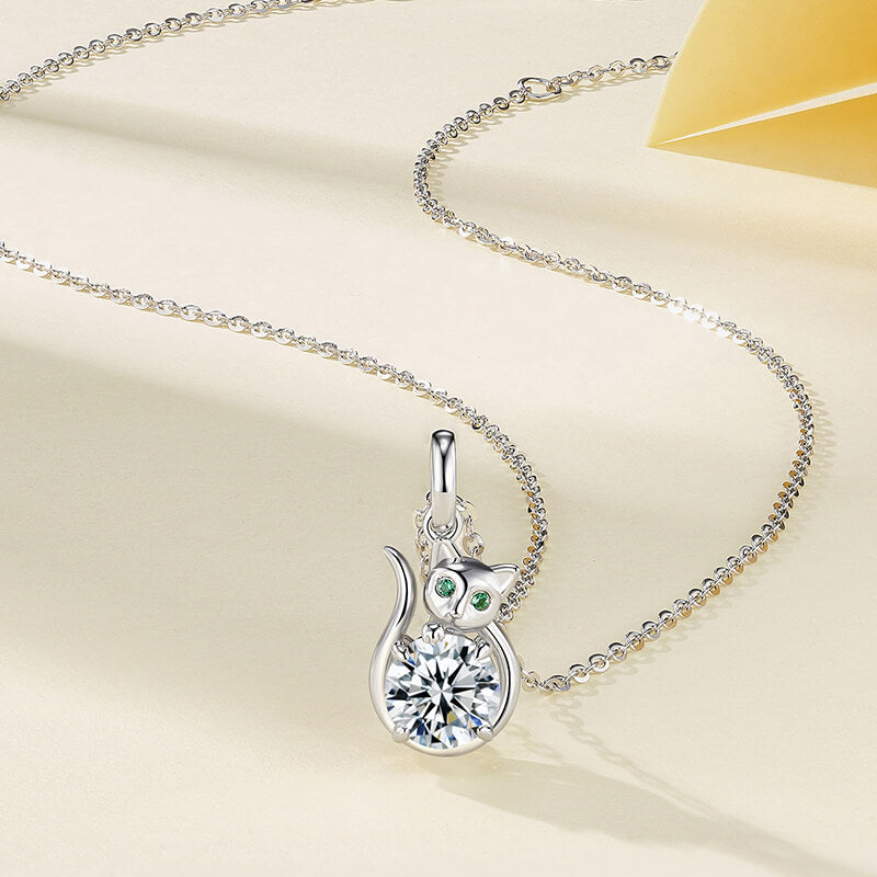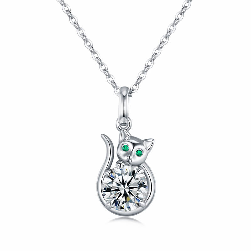 This necklace is inspired by our Animal Kingdom collection. This exquisite lucky cat moissanite pendant necklace is a purr-fect gift for any cat lover.The charming cat pendant features brilliant green eyes and lovingly embraces a dazzling, round-cut moissanite. Known for its exceptional fire and brilliance, moissanite offers a captivating sparkle that rivals a diamond.
